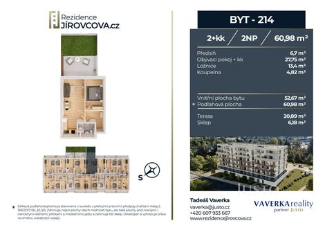 Centrum Českých Budějovic, luxusní interiéry, nejúspornější energetická třída A, moderní technologie, garážová parkovací stání, opravdu velké sklepy a něco navíc: komunitní zahrada pro rezidenty. Představujeme vám Rezidenci Jírovcova v Českých Budějovicích. Hledáte elegantní funkční 1+kk, nejoblíbenější investiční 2+kk, nebo rodinný 3+kk? Chcete bezpečně investovat své peníze, anebo bydlet na místě, kde máte vše po ruce? Vyberte si jeden ze 76 bytů v moderním sedmipodlažním bytovém domě na konci ulice Jírovcova. Tento byt číslo 214, o dispozici 2+kk se nachází v 2. nadzemním podlaží. Plochy bytu a příslušenství jasně a přehledně: Podlahová plocha bytu včetně sklepu (plocha bytu včetně vnitřních příček a sklepu, který je součástí bytu, dle vyhlášky č. 366/2013, §2 a §3) je 60,98 m. Vnitřní plocha bytu (bez příček, bez terasy a sklepu) je 52,67 m. Celková plocha bytu včetně sklepu a terasy (podlahová plocha + sklep + terasa) je 81,87 m. Terasa o výměře 20,89 m. Sklep s výměrou 6,18 m. Tohle bude vaše nová koupelna. Kamenické rohy bez lišt. Velkoformátové dlaždice 60×120 cm. Přesné spáry. Top zařizovací předměty. Promyšlené rozvržení a doplňky. Vybrat si můžete ze dvou nadčasových barevných provedení. Dveře a podlahy. Podlahové vytápění, vinylová krytina. Tři barevná provedení podlah na výběr. Interiérové dveře s výškou 210 cm ve dvou barevných variantách. Chytrá domácnost LOXONE. Ovládání dveří a garáží skrze tablet v bytu. Okamžitá kontrola spotřeby energií za byt. Ovládání teploty v každé místnosti. Ovládání předokenních žaluzií. Stavba: Podrobnosti o provedení stavby domu i bytů najdete podrobněji zpracované v dokumentu Standardy. Může vás však zaujmout: FVE na střeše, bude dohřívat teplou vodu. Část střechy zelená. Mycí box na jízdní kola a kolárna. Vnitřní parkovací stání příprava pro Wallbox. Komunitní zahrada s vyvýšenými záhony. Lokalita: Chůze: 10 min IGY, 20 min náměstí, MHD před domem. Auto: záchytné parkoviště nedaleko domu, blízkost nájezdu na D3. Bus: zastávka prakticky před Rezidencí Jírovcova. Máte možnost si dokoupit vnitřní i venkovní parkovací stání. Vizualizace uvedené ve fotogalerii jsou pouze orientační a mohou se nepatrně lišit u jednotlivých bytů. Pokud chcete více informací, stačí vyplnit formulář u této konkrétní nabídky a my se vám ozveme. Rádi vám pomůžeme zajistit i financování koupě. <a href="https://www.eurobydleni.cz/byty/1_kk/beroun/obec-lodenice/prodej/"><strong>Prodej bytu 1+kk Loděnice</strong></a>