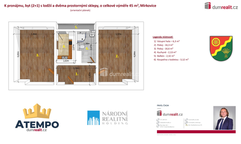 Dumrealit.cz Vám zprostředkuje pronájem světlého prostorného bytu 2+1 (45 m2) s lodžií po celkové rekonstrukci a s dvěma sklepy v obci Mirkovice. Bytový dům se nachází na strategickém místě s dojezdem 10-15 minut do Českého Krumlova, Kaplice nebo Velešína. Byt je situován na západní stranu v klidném místě obce Mirkovice. Podrobné rozkreslení dispozice bytu naleznete na orientačním plánku mezi fotografiemi. Nájemné činí 15.000,- Kč + zálohové platby na energie 3.800,- Kč měsíčně (el. energie, plyn, voda a topení). Doporučuji osobní prohlídku. Více informací Vám poskytne realitní makléř Pavel Čada z RK A TEMPO fungující pod ochranou známkou dumrealit.cz. Ev. číslo: 654762. Energetický štítek: G